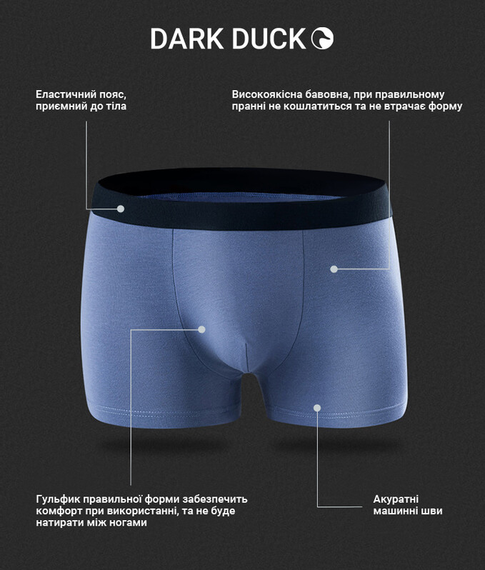 Чоловіча білизна (боксерки) від бренду DARK DUCK. Виготовлені з натуральних тканин. Матеріал: 95% бавовна + 5% еластан. Без візерунків і принтів. Мають середню посадку.